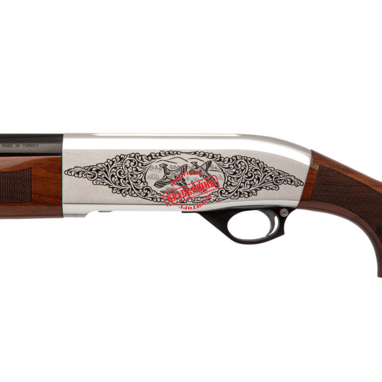 Полуавтоматическое ружье турецкого производства отлично подходит для активной охоты профессионалами и любителями. Ружье оснащено открытой прицельной мушкой, газоотводным механизмом и сменными дульными сужениями. Ствольная коробка обладает более легким весом благодаря анодированному сплаву. Базовая комплектация ружья позволяет при необходимости дополнить его разного назначения стволами (от практической стрельбы до узкоспециализированной охоты). Резиновый затыльник с перфорацией хорошо поглощает силу отдачи. Изюминка модели – цевье и приклад из высококачественного ореха (класс 3) с защитным глянцевым покрытием. Также ствольная коробка украшена изящной гравировкой. Система перезарядки газоотводная, по этой причине пользователь избежит слишком сильного проявления отдачи, а также будет иметь возможность осуществлять стрельбу патронами с уменьшенным весом. Ложе сделано из крепкого и представительного дерева, этим обуславливается совокупность достаточного времени эксплуатации оружия и стильного внешнего вида. Емкость магазина равняется 5+1 боеприпасам, соответственно у пользователя есть возможность выполнить 6 быстрых выстрелов без перезарядки. На рукоятке сделаны специальные насечки. Поэтому повышается надежность удержания, особенно это полезно при неблагоприятных погодных условиях. Есть прицельная планка с мушкой, которая позволяет очень оперативно осуществлять вскидывание, находить цель и осуществлять результативный выстрел. У данной модели применена газоотводная система перезарядки, соответственно появляется возможность применять патроны с меньшим весом и минимизируется ощущение стрелка от возникающей отдачи. Дополнительной сильной стороной карабина является относительно невысокая цена, особенно в сочетании со стрелковыми и техническими особенностями.
