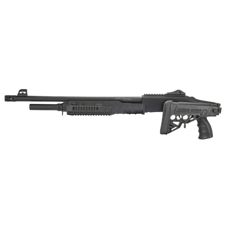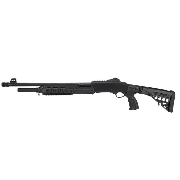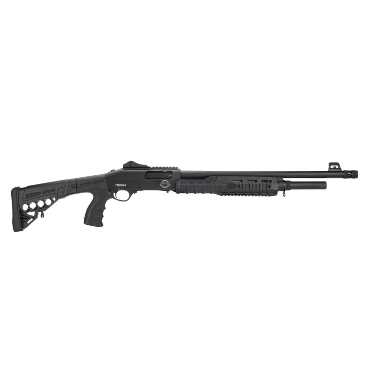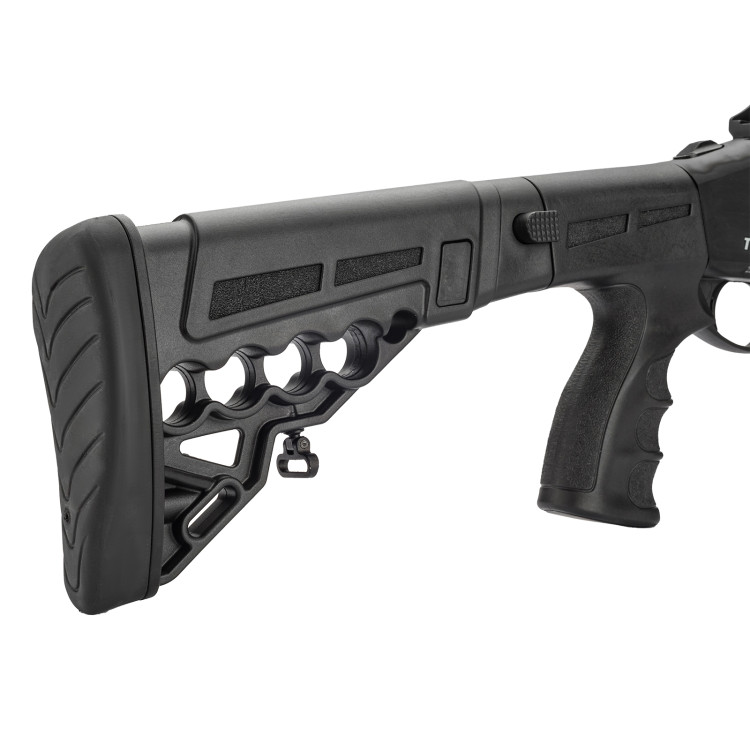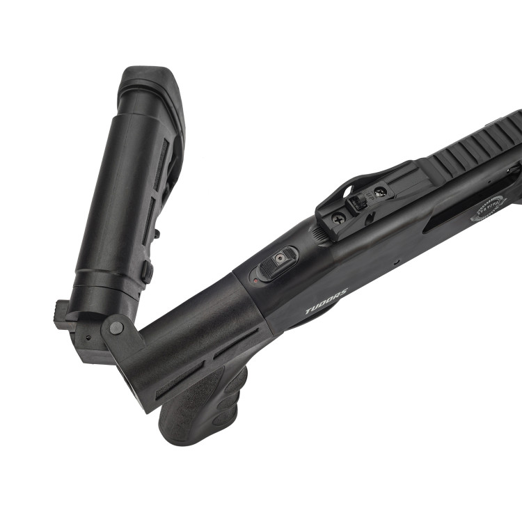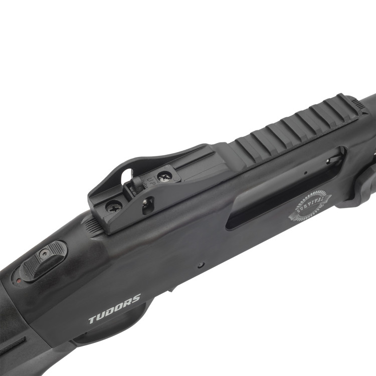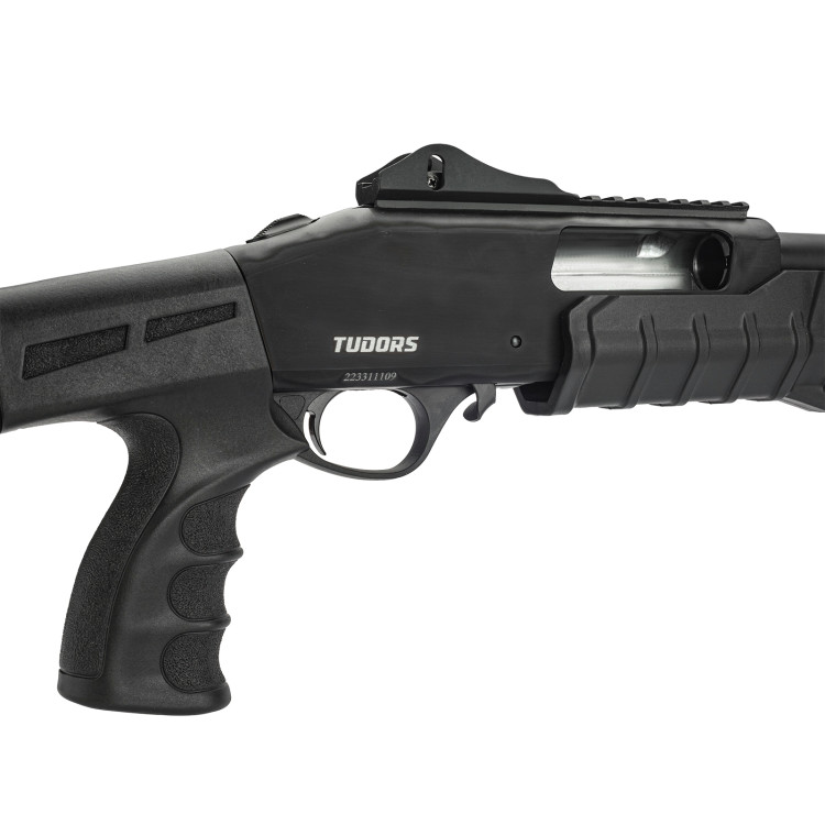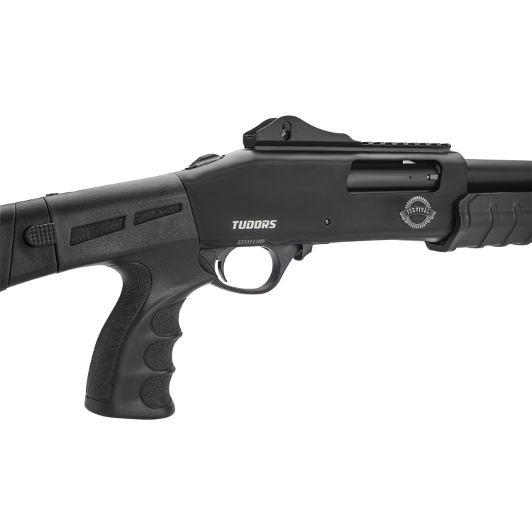 Ружье помповое TUDORS SURVIVAL 12/76 — новинка на украинском рынке и вещь в своем роде уникальная. По совокупности характеристик (с точки зрения использования и для самозащиты, и для тактических задач) и стоимости — лучшее ружье на сегодняшний день на украинском рынке. Очень функциональное цевье, оборудованное тремя направляющими Picatinny, позволяющими разместить любые аксессуары (фонарь, целеуказатель, ручка переноса и проч.) в любой требуемой комбинации. При этом планки съемные, благодаря системе M-LOK их можно либо убрать, либо заменить на другие. Также имеется направляющая Picatinny на ствольной коробке, соответственно можно установить коллиматорный прицел. Причем можно выполнить его установку таким образом (под углом), чтобы одновременно пользоваться и прицелом, и присутствующими открытыми прицельными приспособлениями. Тем более, что светособирающая мушка позволяет с комфортном прицеливаться в условиях плохой видимости — темнота, сумерки и так далее. Плюс есть несколько особенностей, делающих это ружье действительно уникальным. Во-первых, стоит обратить внимание на предохранитель типа Mossberg, с очень удобным расположением. Рукоятка пистолетного типа, выполнена в удобной для пальцев эргономичной форме. На ней также имеется покрытие, делающее удержание еще более надежным. Плюс стрелок может регулировать длину приклада. Кроме этого, стоит обратить внимание на очень удачную форму затыльника, благодаря которой ружье максимально комфортно ложится в плечо. Ну и главная особенность ружья — приклад здесь складного типа, его можно легко и быстро сложить полностью и точно так же быстро привести в исходное положение. Со складным прикладом длина ружья составляет 80 см с небольшим, благодаря чему законодательство позволяет перевозить это оружие в состоянии со сложенным прикладом. На сегодняшний день на рынке подобных помп по совокупности таких тактических характеристик не наблюдается ни у одного производителя. В итоге имеем великолепное ружье для выполнения различных тактических задач, в ситуациях, где требуется быстро маневрировать оружием, для самозащиты. И особенно с учетом цены эта помпа — прекрасный выбор