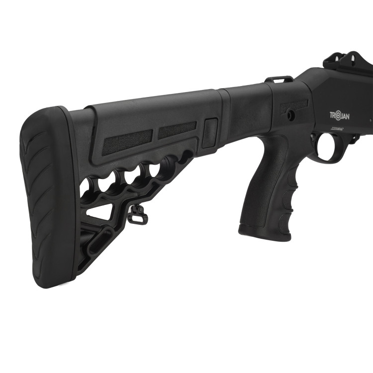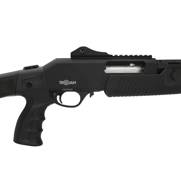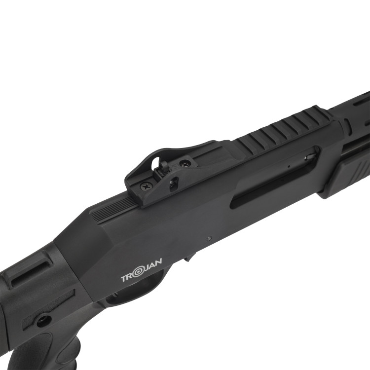 Помповое ружье Trojan PA101 12/76 Pump Action Shotgun Tactical произведено одним из молодых, но при этом очень быстро развивающихся турецких брендов, этому ружью присущи все преимущества подобного производителя. В первую очередь это очень демократичная цена, но и не только она. Оружие обладает целым рядом сильных сторон, благодаря которым его приобретение может быть весьма целесообразным. Обращает на себя внимание рукоятка пистолетного типа, благодаря которой удерживать оружие во время стрельбы и смены сектора ведения огня максимально удобно. Имеется затыльник на прикладе, эргономика самого приклада на достаточно высоком уровне. Оружие оборудовано открытыми прицельными приспособлениями в виде целика и мушки, благодаря им стрелок имеет возможности ввести быструю и прицельную стрельбу навскидку. Кроме того, имеется направляющая для установки оптического прицела. Емкость магазина помпового ружья Trojan PA101 12/76 Pump Action Shotgun Tactical составляет 5 боеприпасов плюс 1 в патроннике, общая длина ствола составляет 47 см — оптимальная длина ствола для ведения стрельбы на короткие и средние расстояния. Преимущества помповой системы перезарядки заключаются в надежности и одновременно с тем в простоте. Именно поэтому ее выбирают многие любители не только охоты. Это оружие будет отличным выбором также и как средство для защиты себя, своих близких и своего дома точка. Но еще это помповое ружье весьма эффективно во время выполнения различных тактических задач, особенно если оснастить оружие дополнительными аксессуарами (например, коллиматорным прицелом), значительно повышающими эффективность оружия. Тем более, что цена ружья Trojan PA101 12/76 Pump Action Shotgun Tactical весьма способствует тому, чтоб его приобрести.