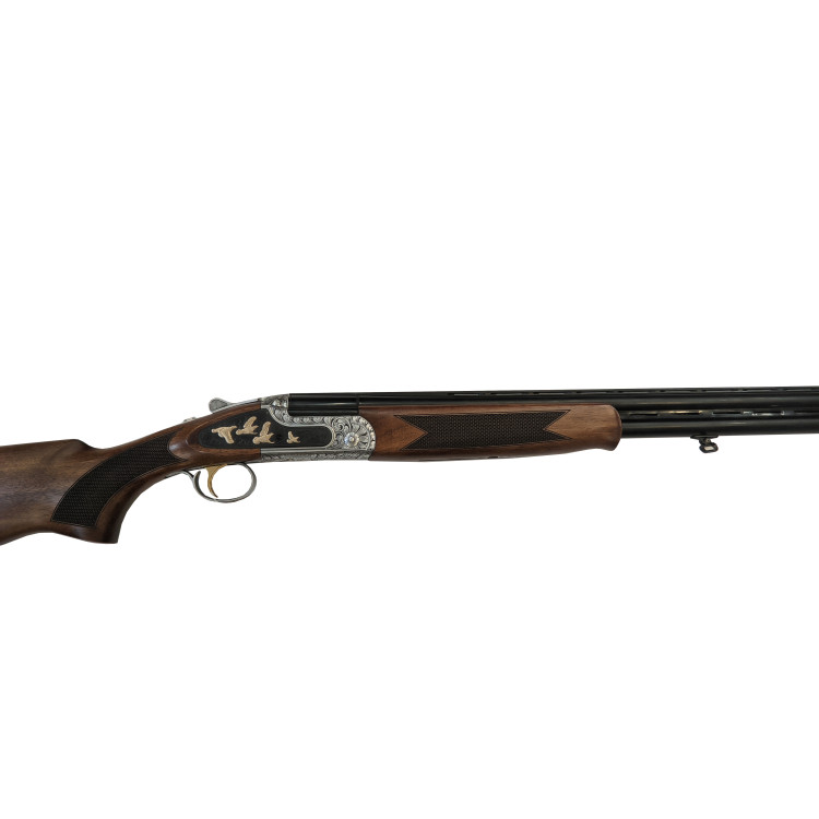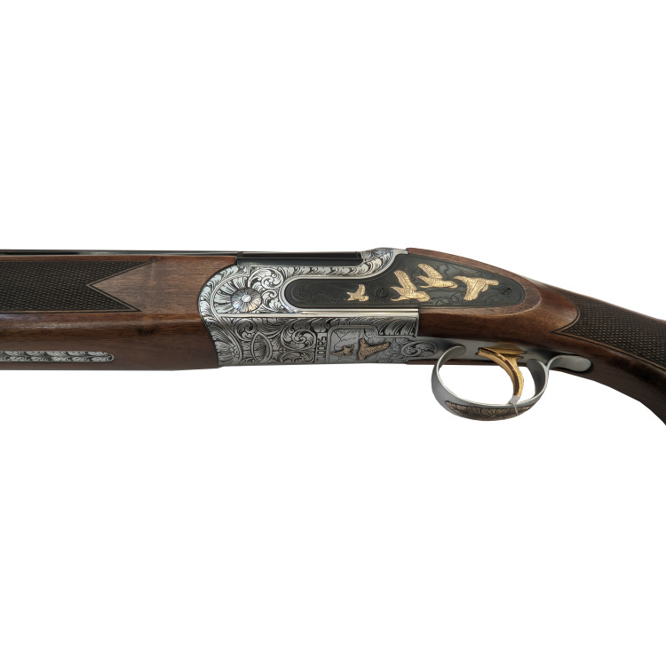 Приклад и цевьё изготовлены из отборного турецкого ореха; структура волокон близка к породам, применяемым в премиальных линейках Benelli и Beretta, что отражается в механической прочности и внешней презентабельности изделия. Эргономическая схема органов управления включает удобный предохранительный рычаг и селектор с цветовой маркировкой; индикаторы красной точки и белой метки служат для визуальной индикации активного ствола. Обработка древесины выполнена с контролем влажности и плотности для стабильности размеров.