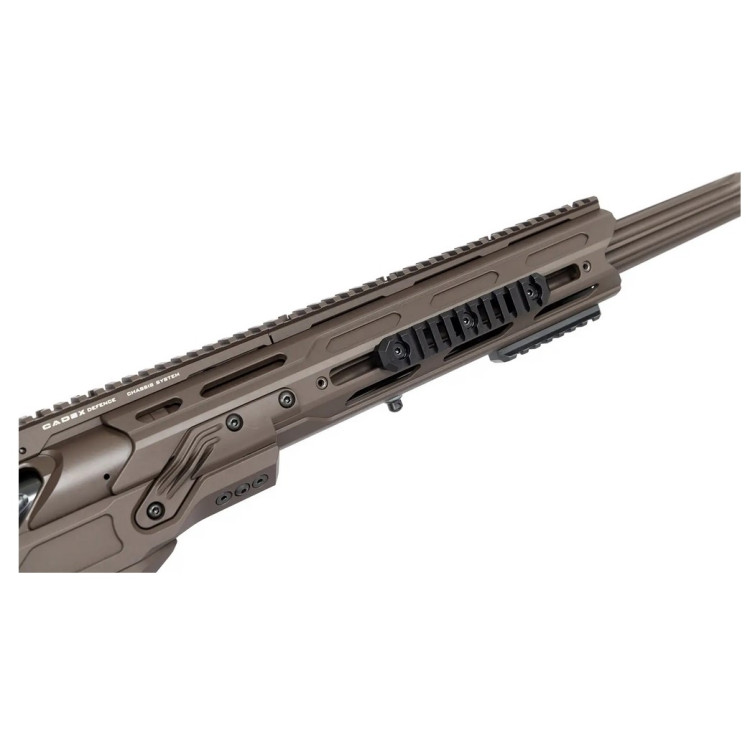 УСМ 2-ступенчатый Cadex DX2, с независимой настройкой каждой ступени. Диапазон регулировки усилия спуска составляет от 0,9 2,2 кг. Комплектуется алюминиевым шасси Cadex Dual Strike с V-образным беддингом. Конструкция из основгого модуля с интеграцией креплений для цевья, магазина и рукоятки.