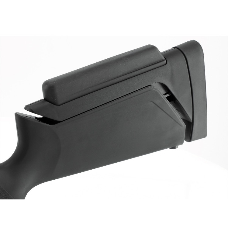 Конструкция приклада имеет возможность регулировки в пяти положениях, что помогает адаптировать Umarex Hammerli Force B1 под различные антропометрические параметры стрелка. Губчатая щека, легко устанавливаемая на двух уровнях, добавляет комфорта при прицеливании. Предохранительный механизм включает механическую блокировку и встроенную защиту спускового крючка. Нижняя часть цевья оборудована интегрированной планкой M-LOK®, что дает возможность крепления вспомогательных аксессуаров, включая сошки и ремни через интерфейс QD.