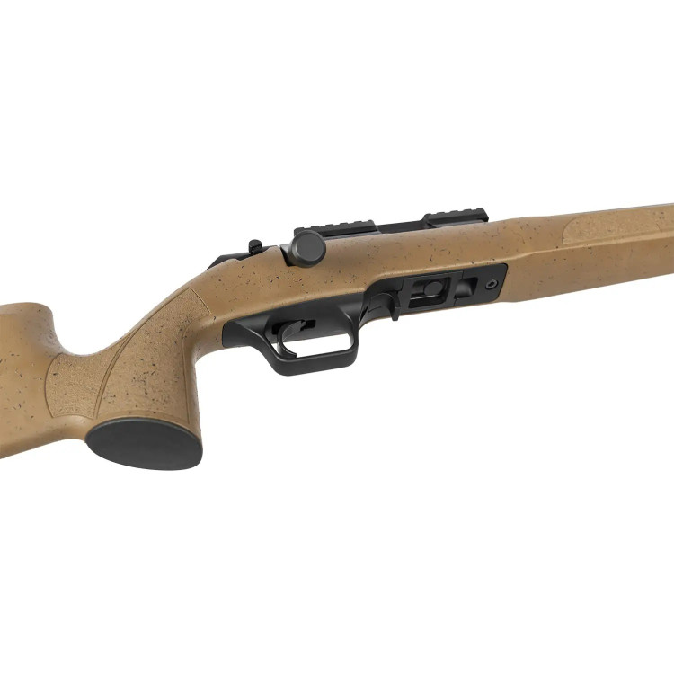 Ложа карабина изготовлена из синтетического материала ABS, что придает ему прочность и легкость. Удобная щека обеспечивает комфортное прицеливание, а универсальная направляющая Picatinny с винтами #8-40 позволяет легко устанавливать оптические прицелы и другие аксессуары. Шаг нарезки ствола составляет 1:16 с шестью канавками, что оптимизирует стабилизацию пули в полете.