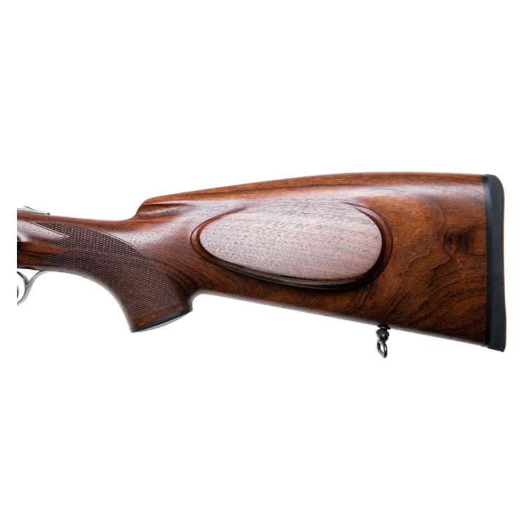 Орех не ниже 4-го класса. Приклад с "кабаньей спинкой", пистолетной рукояткой и "немецкой" щекой. Пропитан маслом.
