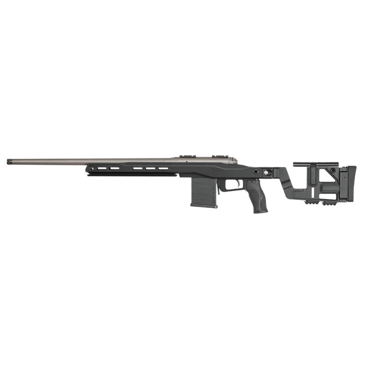 УСМ AccuTrigger регулируемый, рабочий диапазон усилия спуска от 1,1 до 2,7 кг; конструкция минимизирует вероятность случайного срабатывания без внешнего воздействия. Питание — сменный коробчатый магазин MDT формата AICS; взаимодействие с приемником выполнено по стандартному интерфейсу для быстрого извлечения и установки.