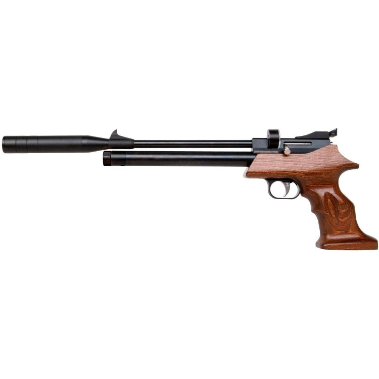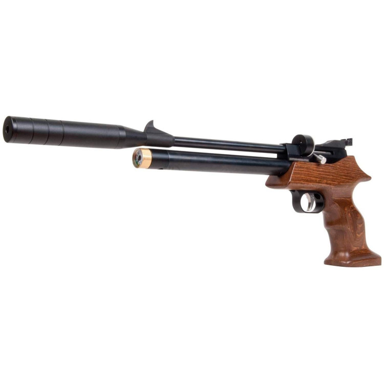 Конструкция пистолета включает стальной нарезной ствол длиной 22,9 см, что способствует повышению точности и стабилизации полета пули. Дополнительно на конец ствола установлен металлический саундмодератор, уменьшающий уровень шума и компенсирующий вес оружия. Ложе пистолета выполнено из древесины бука для долговечности и эстетической привлекательности, а также придает устройству прочность и устойчивость. Спортивная эргономичная рукоять с выемкой под палец и насечками гарантирует комфортное удержание во время стрельбы.