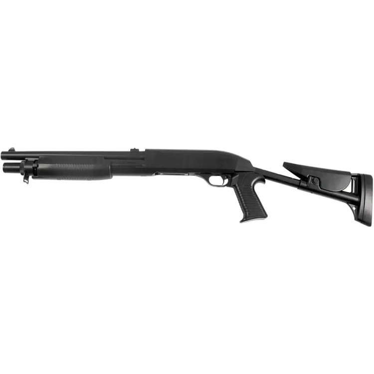 Страйкбольный дробовик ASG Franchi SAS 12 Flex-stock кал. 6 мм представляет из себя реплику ставшей уже легендарной помпы от итальянского производителя Franchi. Огнестрельный аналог известен, как один из наиболее надежных и вариантов для использования специальными подразделениями полиции в разных странах. Оружие функционирует на основе сжатия пружинного механизма, который отличается простотой и надежностью функционирования даже в сложных условиях. Основное предназначение оружия — тренировка начинающих стрелков, а также отработка навыков до автоматизма опытными стрелками.