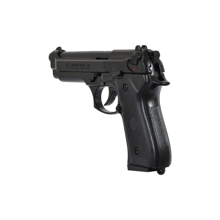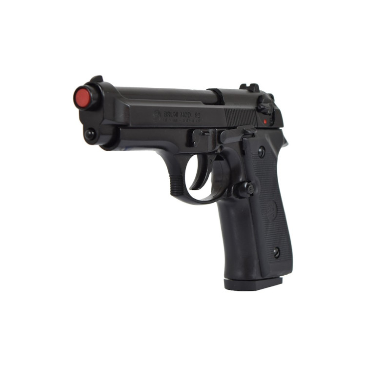 Сигнальный пистолет Bruni 92 cal.9 РАК ST сконструирован в виде реплики известного образца Beretta 92 и произведен для стрельбы холостыми боеприпасами 9 мм РАК. Корпус изделия изготовлен с использованием сплава из цинка, благодаря чему масса модели приближается к весовым характеристикам оригинала. Накладки рукоятки из полимера, что позволяет добиться оптимального сочетания легкости и прочности конструкции. При проектировании модели учтены требования метрической системы: размеры, указанные в дюймах, пересчитаны в сантиметры, футы – в метры, а вес в фунтах – в килограммы.