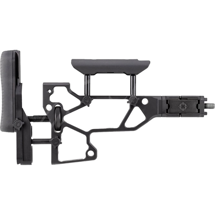 Приклад от канадского производителя MDT спроектирован для того, чтоб его можно было установить на базу шасси MDT ESS XTN Interface. Если сравнивать с предыдущей моделью, то данное обновление выполнено в настолько же прочной конструкции, однако одновременно с тем обладает уменьшенным весом. Это обеспечивается благодаря использованию особого сплава на основе алюминия — настолько же прочный и надежный, но более легкий. Стрелок получает максимальный комфорт ведения огня. Приклад позволяет осуществлять различные регулировки — длину, высоту, наклон и т.д. Плюс нижнюю часть есть возможность оснастить направляющей, позволяющей осуществить установку адаптера упора.