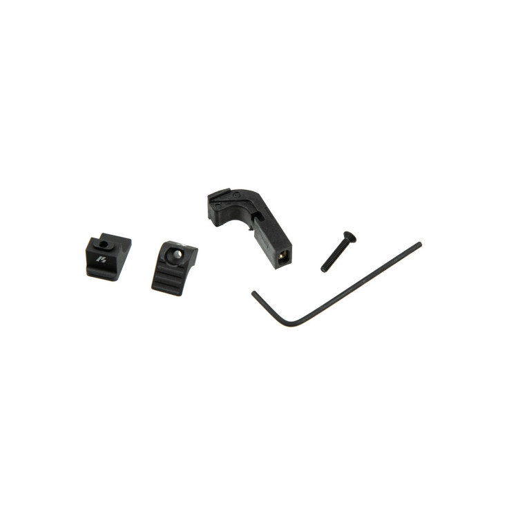 Алюминиевые компоненты имеют анодированное покрытие, что дополнительно защищает их от коррозии и внешних воздействий. В комплекте два алюминиевых элемента и один винт M2, что облегчает монтаж и замену кнопок. Важно отметить, что устройство совместимо с моделями Glock Gen 4 и Gen 5, включая 17, 19, 19X, 22, 23, 26, 27, 31, 32, 33, 34, 35, 37, 38, 39 и 45 и несовместимо с моделями Glock 36, 42 и 43.