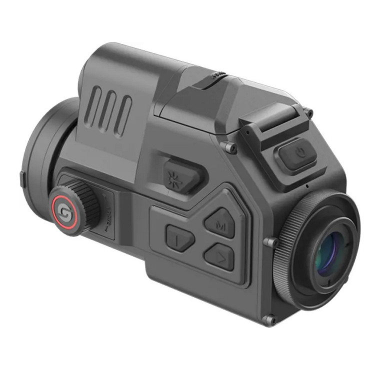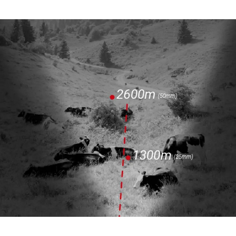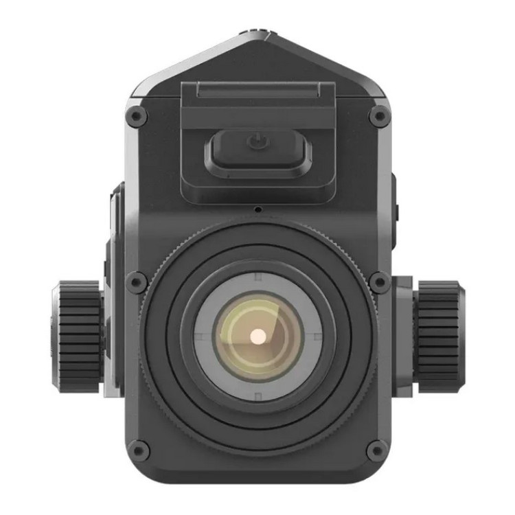 В основе модели стоит высокочувствительный VOx-сенсор 640×512 с шагом пикселя 12 мкм. Небольшой размер пикселя помогает получить более детализированное изображение при компактных габаритах прибора. Показатель NETD 20 mK говорит о высокой тепловой чувствительности: насадка улавливает даже минимальные перепады температуры, поэтому картинка остается информативной в холод, сырость и при слабом тепловом контрасте. Объектив 50 мм F1.0 пропускает больше теплового излучения, что положительно влияет на яркость и чистоту изображения. Дальность распознавания объектов достигает 2600 м, а частота обновления 50 Гц обеспечивает плавную картинку без рывков при наблюдении за движущимися целями.