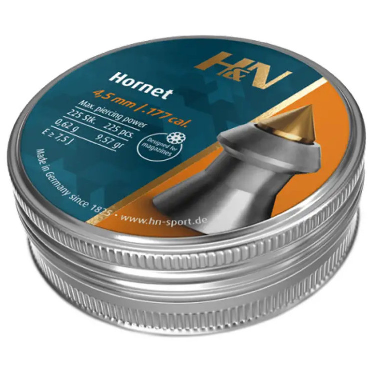 Пневматические пули H&N Hornet калибра 4.5 мм и весом 0.62 гр характеризуются средней тяжестью — это обуславливает устойчивый полет и высокую точность, что делает их хорошим выбором для охоты на различные виды животных.