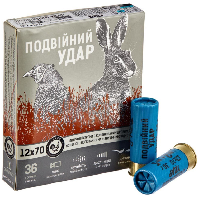 Патрон Тахо "Двойной Удар" кал. 12/70 дробь №2+5 специально разработан для эффективной охоты на различных видов дичи, включая крякву, фазана, тетерева, вяхиря, лисицу, зайца и даже гуся.