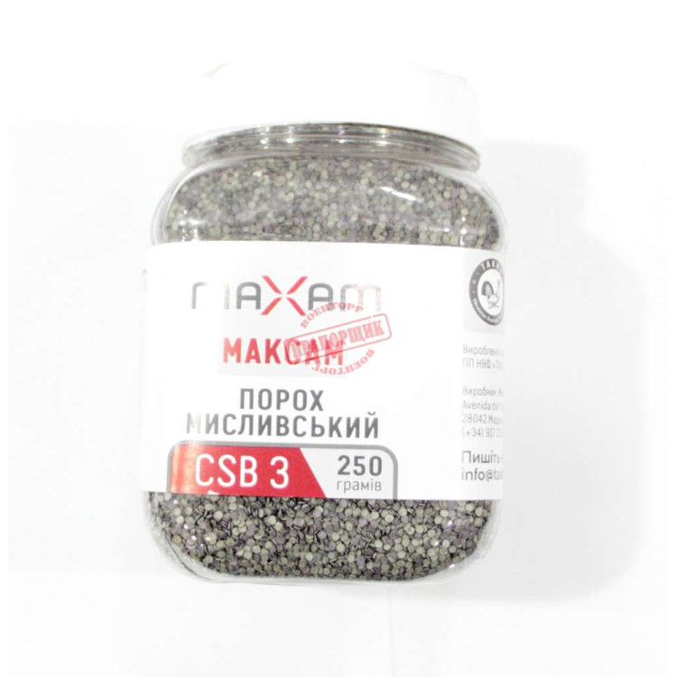 ТАХО – официальный эксклюзивный представитель порохов MAXAM в Украине представляет 14 видов оригинального пороха. Серия CSB – гамма охотничьих порохов в серии позволяет максимально точно подобрать оптимальную схему снаряжения классических патронов. Спортивный порох лучшего качества. Мягкий, средней плотности, позволяют снаряжать скоростные патроны с вариативными характеристиками. Калорийность - 950 кал/г, форма - диск, размер - 1,7*0,3мм, плотность - 535г/л, цвет - рябой серый. Упакован в пластиковую банку, в которой хорошо виден сам порох. Предназначен для снаряжения дробовых и пулевых патронов.