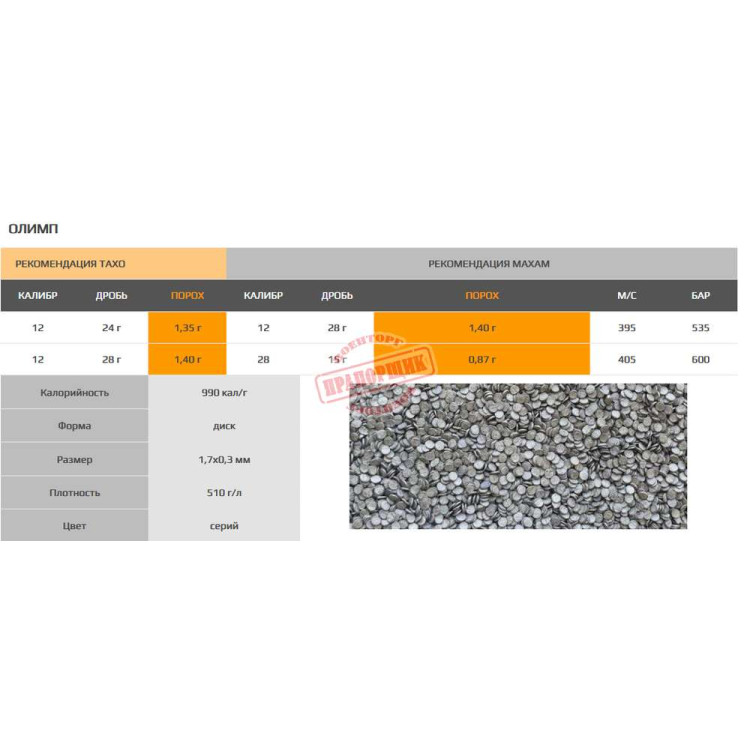 Порох "Олимп" – спортивный порох наивысшего мирового качества. Мягкий порох средней плотности, позволяет снаряжать скоростные патроны с вариативными характеристиками. Бездымный спортивный вид пороха наилучшего качества, разработан на основе CSB 5. Подходит для снаряжения скоростных патронов с разными характеристиками. Порох произведено в Испании по заказу НПФ "ТАХО". Новая упаковка позволяет удобно хранить и транспортировать заряд. В прозрачной емкости хорошо видно качество пороха. Цвет - серый, форма- диск, плотность - 510 г/л, калорийность - 990 кал/г, размер - 1,7*0,3 мм.