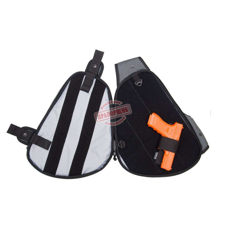 Внутрішній простір містить три функціональні зони різного призначення. Основний відсік розрахований на розміщення зброярського модуля, додатково присутні два місткі відділення із системою кишень для магазинів, акумуляторів, компактних приладів, документів та інших предметів. Внутрішні панелі посилені щільною підкладкою для фіксації елементів, що переносяться, знижуючи ризик зміщення під час пересування пересіченою місцевістю, транспортування або активного маневрування. Фурнітура представлена блискавками з посиленою бігунковою групою та вшитими напрямними для стабільного закривання.
