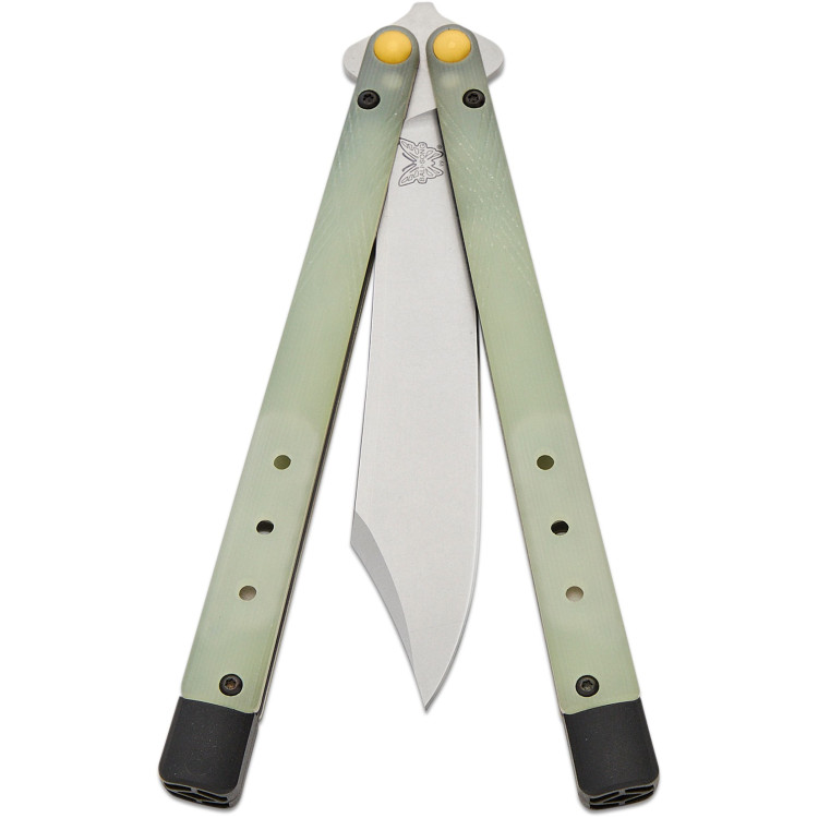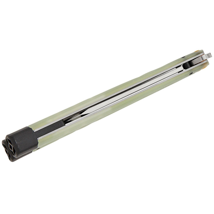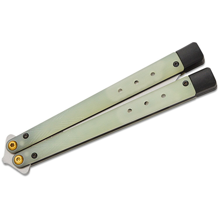 Руків'я виготовлене з напівпрозорого матеріалу Jade G10, що дозволяє користувачеві оцінити внутрішню конструкцію та механізм ножа. Особливістю моделі є знімні вольфрамові обважнювачі та подовжувачі руків'я, які дають змогу налаштовувати центр ваги та баланс ножа відповідно до індивідуальних уподобань. Така система особливо корисна для виконання трюків і фліпів, забезпечуючи контроль і стабільність під час маніпуляцій.