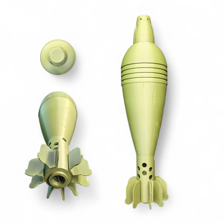 Ця модель мінометної міни калібру 82 мм виконана в натуральну величину з використанням високоякісного філаменту. Її розміри становлять 32,5 см в довжину та 8 см в діаметрі. Завдяки точній деталізації, модель дозволяє детально вивчити всі елементи зовнішньої будови цього вибухонебезпечного пристрою.