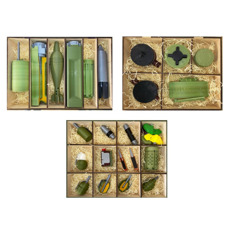 В комплект також входять макети осколкової мінометної міни калібру 82 мм і протитанкової міни ПТМ-3 у розрізі. Ці навчальні матеріали дозволяють детально вивчити внутрішній устрій мін і зрозуміти принципи їх роботи. Макети надають можливість детального аналізу компонентів, що важливо для навчання саперів та спеціалістів, які займаються розмінуванням.