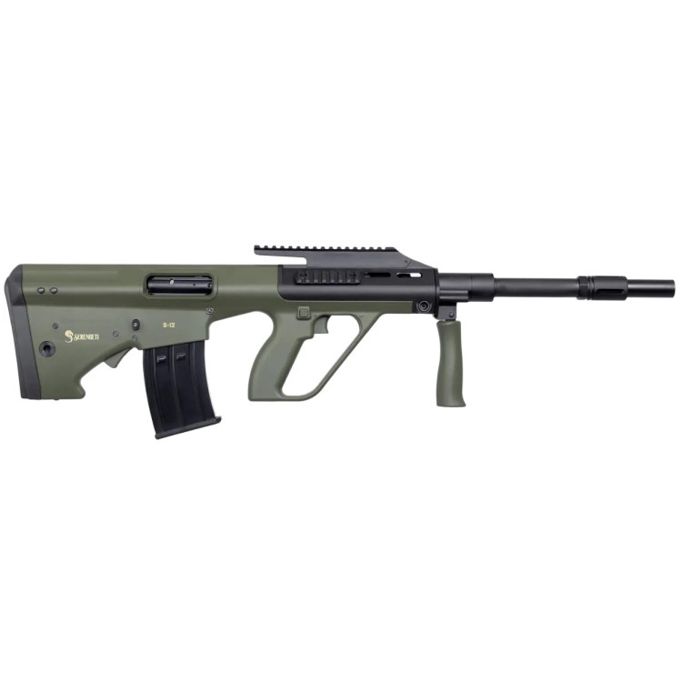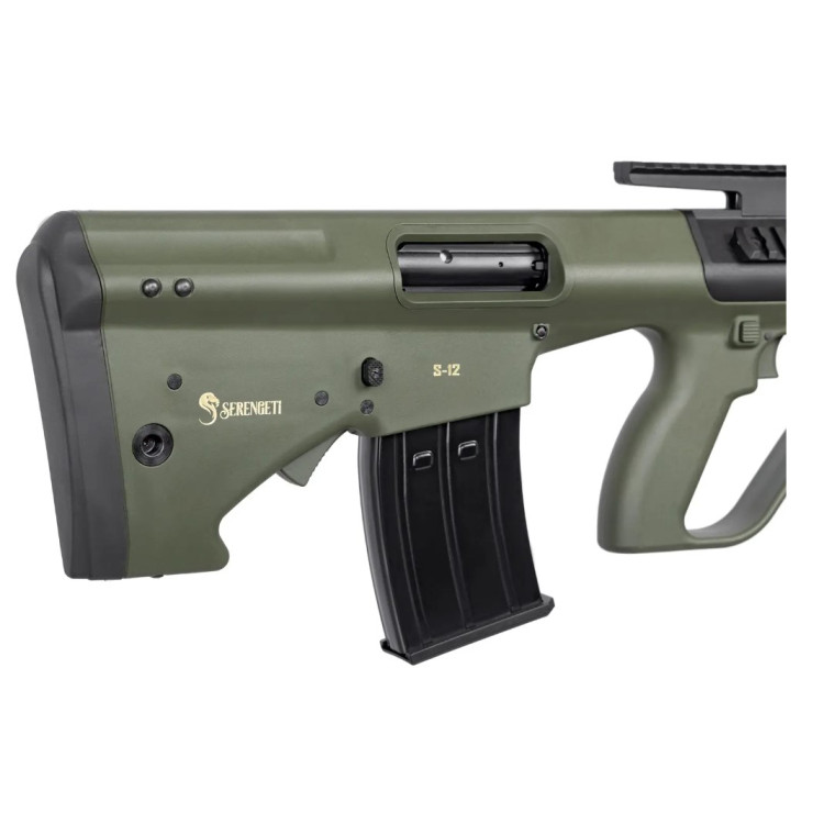 Serengeti S-12 Green кал. 12/76 — напівавтоматична гладкоствольна рушниця у компонуванні bull-pup. Така схема дає змогу зберегти достатню довжину ствола при більш компактних загальних габаритах, тому модель зручніша під час транспортування, зберігання та роботи в обмеженому просторі. Конструкція виконана за мотивами відомих ергономічних рішень Steyr AUG, що позначається на розташуванні органів керування та загальному балансі.