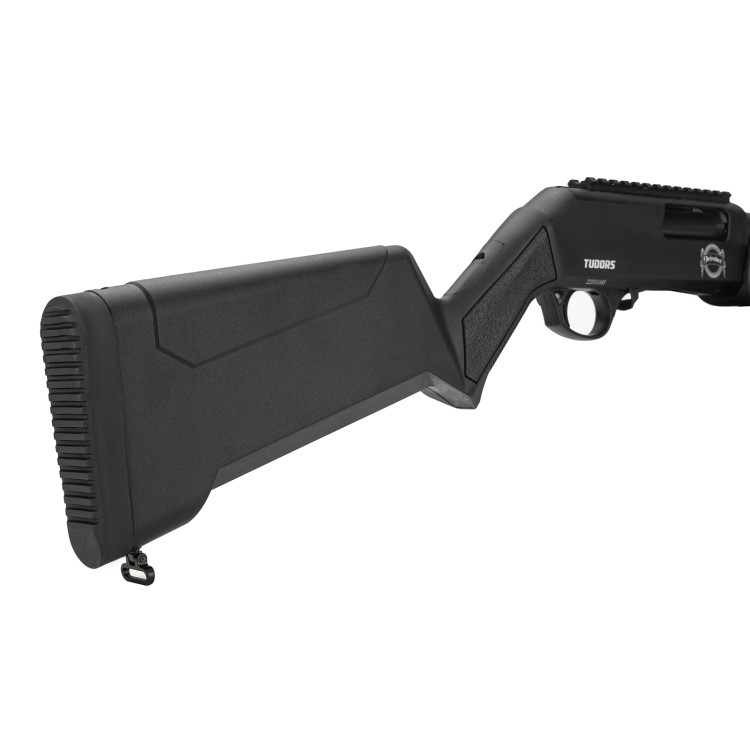 Звертає на себе увагу також дизайн приклада і рукоятки — і виглядає цікаво і ергономіка забезпечує зручність завдяки місцю для великого пальця. Приклад обладнаний досить потужним потиличником, який зручно лягає в плече, тим самим сприяючи мінімізації негативного впливу віддачі на стрілка. Плюс зброя для самозахисту має бути такою, яку моментально можна підкинути і максимально швидко виконати точний постріл, і дана «помпа» в цьому сенсі стане відмінним вибором. В якості відкритих прицільних пристосувань тут є світлозбиральна мушка зеленого кольору, за допомогою якої навести зброю на ціль в умовах поганої видимості (туман, сутінки) буде не проблема. В результаті сукупність характеристик і функціональних можливостей помпової рушниці TUDORS Defender з урахуванням її невисокої вартості можна назвати унікальними на ринку України.