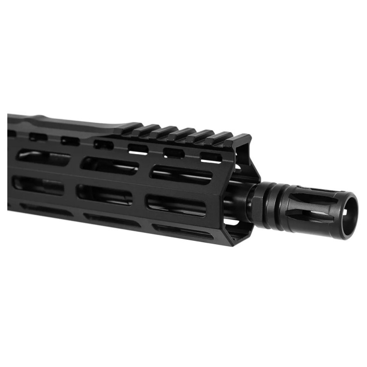 Ствол довжиною 14,5" (368 мм) виготовлений зі сталі 4140 та азотований. Азотування — це термохімічна обробка, що підвищує твердість поверхні, зносостійкість і корозійну стійкість без шкоди для геометрії каналу ствола. Крок нарізів 1:8" оптимально підходить для куль різної маси. Дульна різьба 1/2"-28 дозволяє встановлювати широкий спектр сумісних пристроїв. У комплекті — стандартний полум’ягасник A2 Flash Hider.