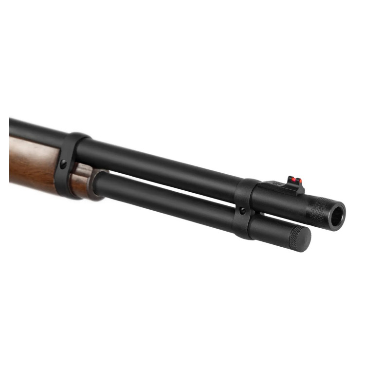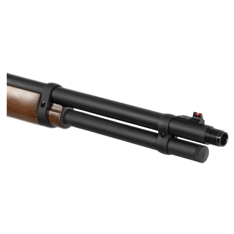 Приклад англійського типу виконаний без пістолетної рукоятки; приклад і цівка виготовлені з турецького горіха, що визначає зовнішній вигляд і тактильні характеристики. Цілик виконано з можливістю регулювання; штатна мушка оснащена червоним оптоволоконним елементом, орієнтованим на швидке візуальне центрування. Підствольний магазин розрахований на вісім набоїв калібру .44 Magnum, що задає ємність боєприпасів при послідовній стрільбі.