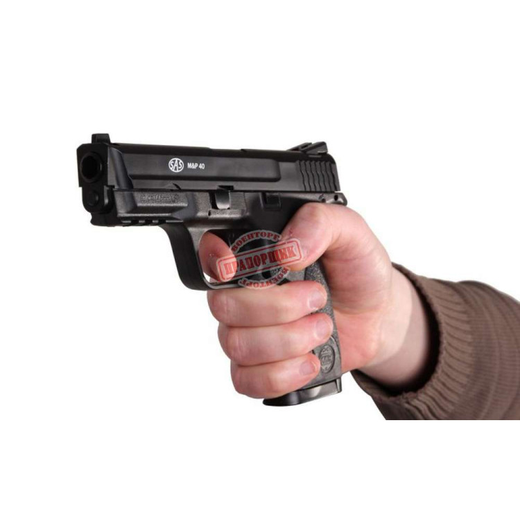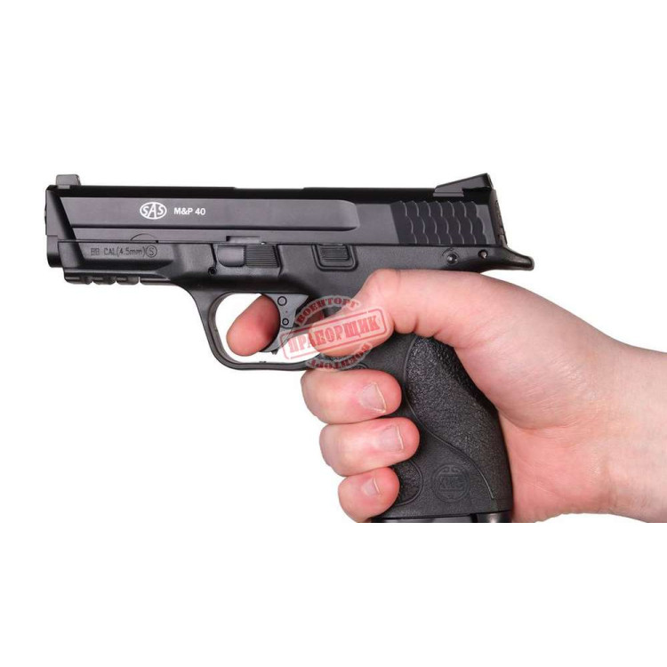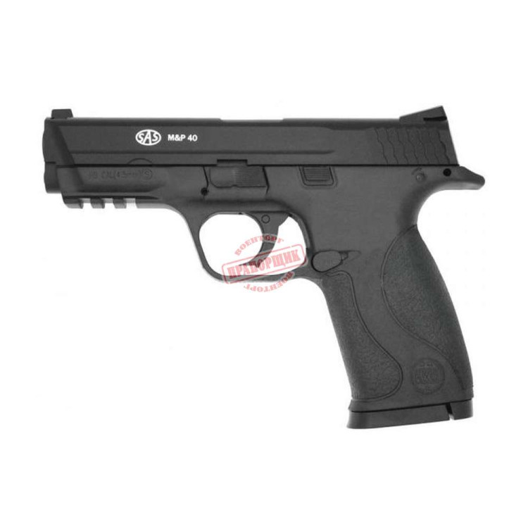 Пістолет пневматичний SAS S&W MP-40 від бренду, який знайомий першокласною якістю продукції. Виробник давно створює різноманітне спорядження для стрільців, у результаті напрацьований досвід та використані технології дозволяють випускати першокласну, але водночас вигідну за ціною продукцію. Оскільки при виробництві використовувалися першокласні комплектуючі, то гарантовано тривалий період функціонування. SAS MP-40 є пневматичною копією пістолета Smith&Wesson MP-40, який користується популярністю у різних органах правопорядку. Пістолет виконаний з якісного пластику та має латунний гладкий ствол.