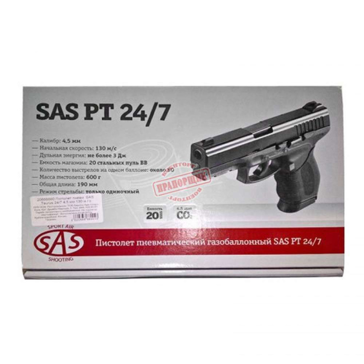 Пневматичний пістолет SAS Taurus 24/7 є продукцією відомої компанії. Виробник багато років спеціалізується на створенні професійної продукції для стрільців, відповідно багаторічний досвід та сучасні технології дозволяють випускати першокласну, але привабливу за ціною продукцію. Оскільки під час виробництва використовувалися якісні комплектуючі, гарантується тривалий період служби. SAS Taurus 24/7 простий у використанні, але надійний. Простота і навіть аскетизм ліній робить SAS Taurus 24/7 елегантним і в той же час стильним.