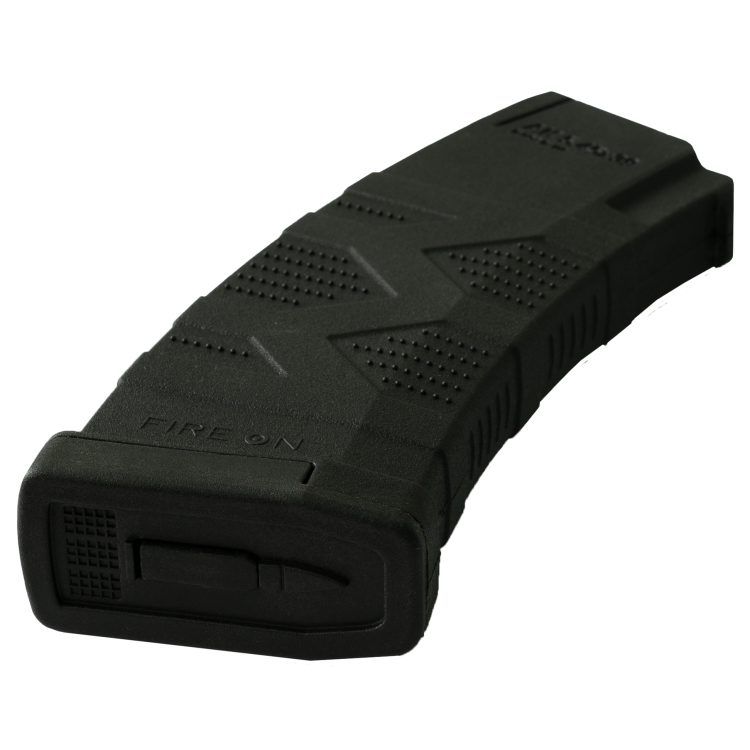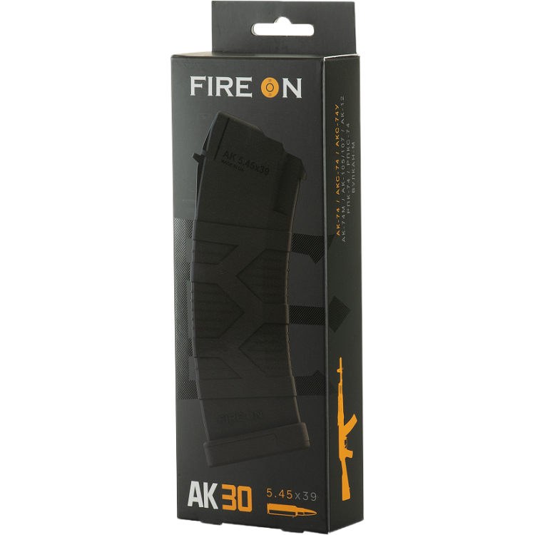 Магазин FIRE ON AK30 вміщує в себе 30 патронів, що обумовлює добрий вогневий потенціал, збільшує тривалість стрільби без необхідності частої перезарядки. Його поверхня виконана з шорсткостями і виступами, що формують характерний малюнок «Тризуб». Ці елементи не тільки надають магазину стильний зовнішній вигляд, але і виконують важливу функцію в підвищенні зчеплення і стійкості при ручній установці і вилученні магазину. «Тризуб» на магазині символічно уособлює його походження, а також додає елементи характеру, роблячи його невід'ємною частиною зовнішнього вигляду власника і його зброї.