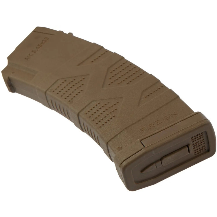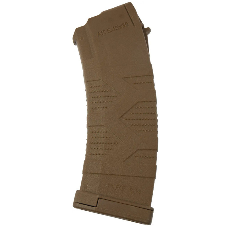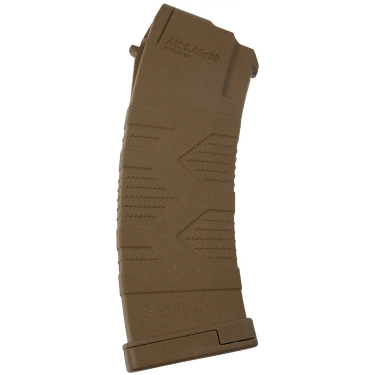 Магазин FIRE ON AK30 калібру 5,45x39, виконаний в стильному відтінку Flat Dark Earth (FDE) — продукт української розробки від бренду Fire On. Компанія зарекомендувала себе як надійний виробник збройових компонентів, що поєднують в собі інноваційні рішення і високу ступінь безпеки. Магазин призначений для використання з різними варіантами гвинтівок, включаючи АК-74, АКС-74, АКС-74У, РПК-74, АК-12 і АК-105.