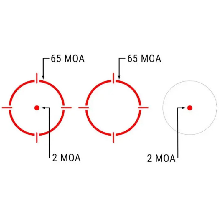 Технологія MRS (Multi-Reticle System) дозволяє вибирати з 3 різних видів сіток: точка 2 MOA для високоточної стрільби, коло діаметром 65 MOA для швидкого захоплення цілі і комбінація точки і кола для адаптації до різних ситуацій. Це дає гнучкість і можливість вибирати оптимальний режим в залежності від умов стрільби.