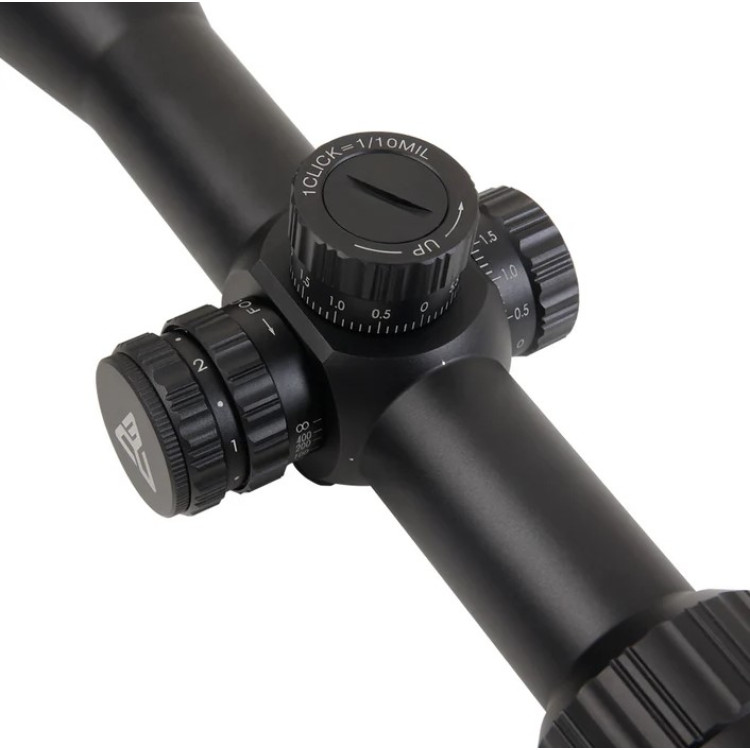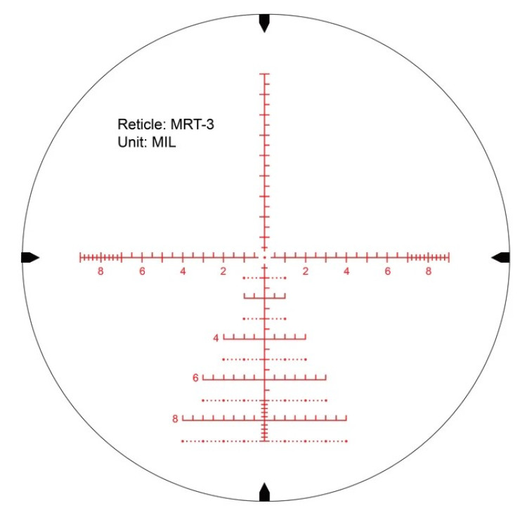 Технічні характеристики включають турелі для регулювання вертикального і горизонтального прицілювання з кроком 1/10 MIL, а також можливість блокування та скидання до початкової позиції. Загальний діапазон переміщення складає 14.5 MIL, що дозволяє робити точні поправки на великі відстані. Крім того, приціл оснащений прицільною сіткою MRT-3 з червоною підсвіткою і 6 рівнями яскравості, що полегшує прицілювання при різних рівнях освітленості.