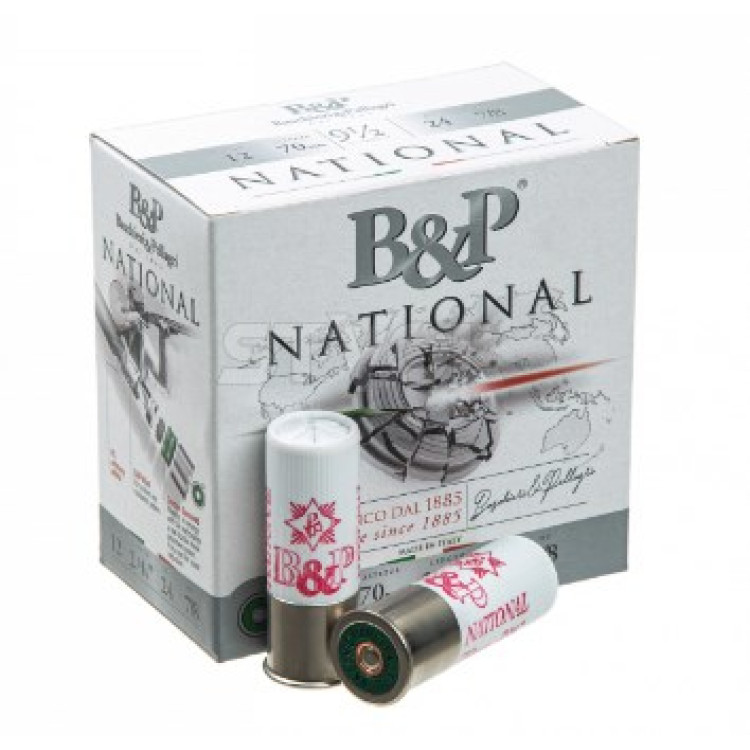 Патрон спортивний B&P NATIONAL К. 12/20/70 25/ 250шт .№ 9.5 24гр — боєприпас від одного з найбільш відомих і авторитетних виробників патронів в світі. Компанія Baschieri&Pellagri у всьому світі відома, як виробник першокласного пороху, гільз і боєприпасів до гладкоствольної зброї різних калібрів. Всім стрільцям, від новачка до експерта, B&P дає можливість поліпшити свої стрілецькі якості і впевненість в собі з патронами B&P: «м'яка, стабільна і неперевершена якість» — так компанія презентує свої патрони і відгуки користувачів підтверджують ці слова.