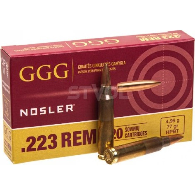Патрон нарізний GGG k.223Rem 77gr (4.99 р.), HPBT NOSLER — боєприпас від відомого виробника, який відомий високою якістю патронів. Відрізняється хорошою точністю і купчастістю, купчастість близько 2-3 см при стрільбі з відстані 100 м. Тип кулі HPBT (hollow point boat tail), характеризується відмінною стабілізацією кулі, коли вона здійснює перехід на дозвукову швидкість. Відповідно цей боєприпас буде хорошим вибором, коли стоїть завдання вражати ціль з далеких відстаней. Початкова швидкість у боєприпасу GGG HPBT NOSLER становить близько 855 м/сек, а балістичний коефіцієнт G1 — 0,362.- Відгуки