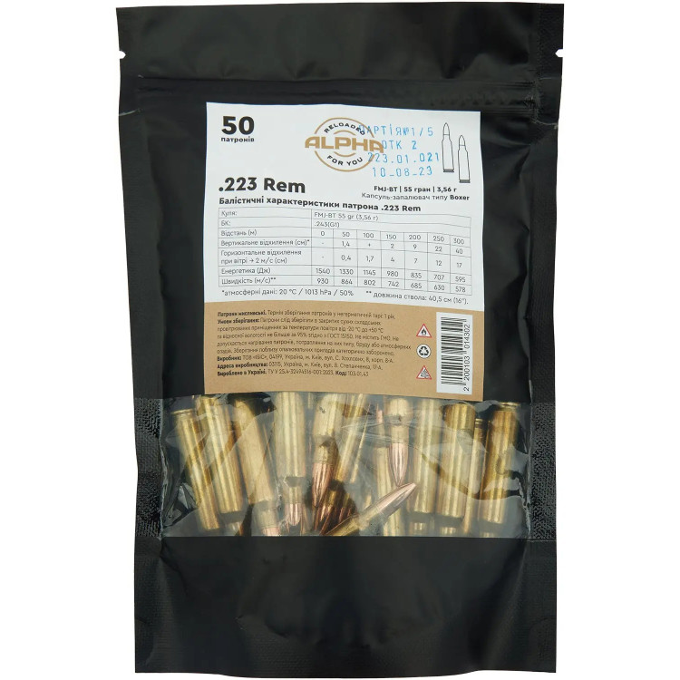 Патрон ALPHA кал. 223 Rem пуля FMJ-BT маса 55 гр (3,56 г) 50 шт
